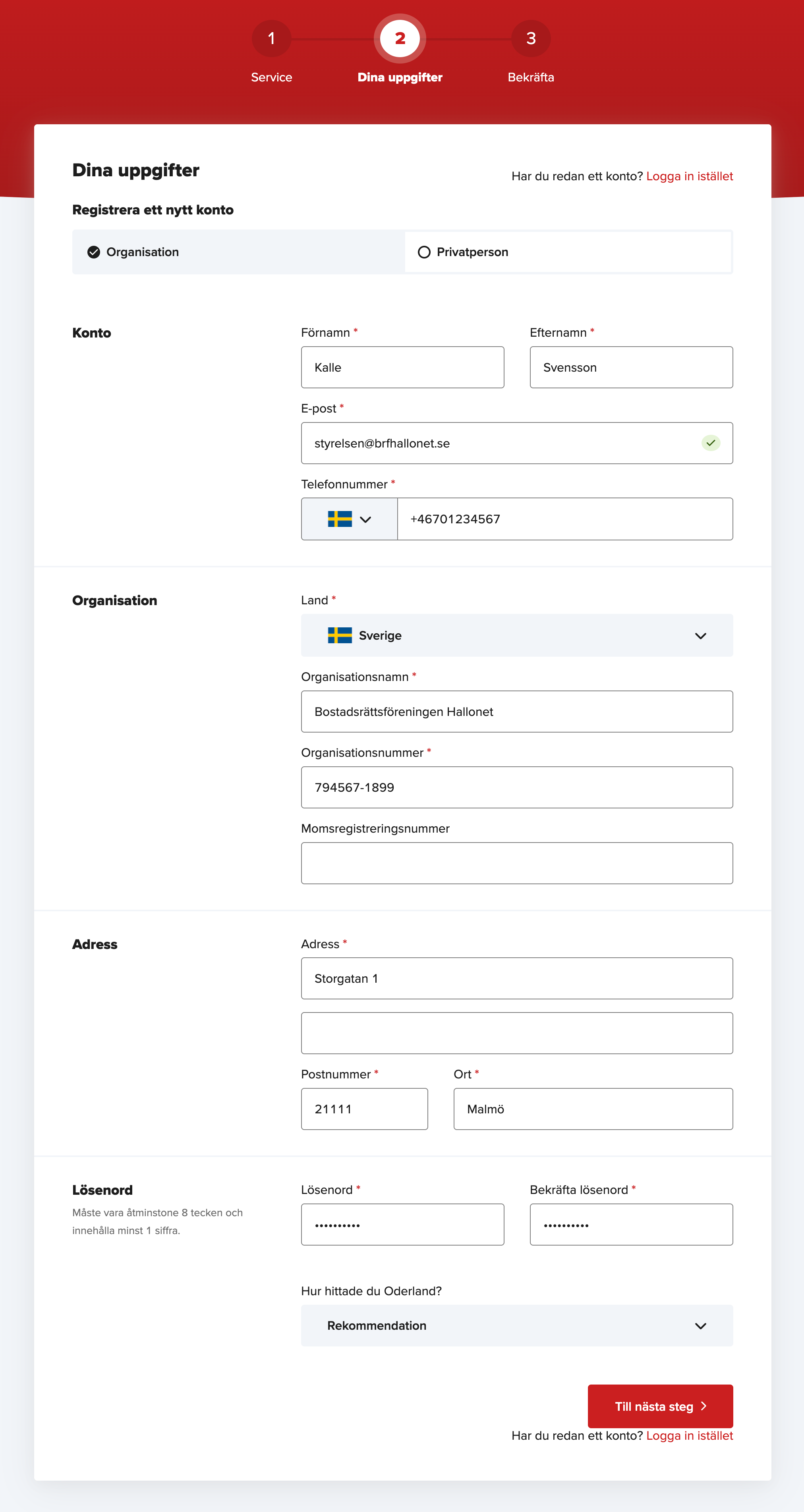- Gå vidare tills era uppgifter efterfrågas och fyll i att det gäller ”Organisation” och inte privatperson. Nedan är ett exempel på hur det kan se ut